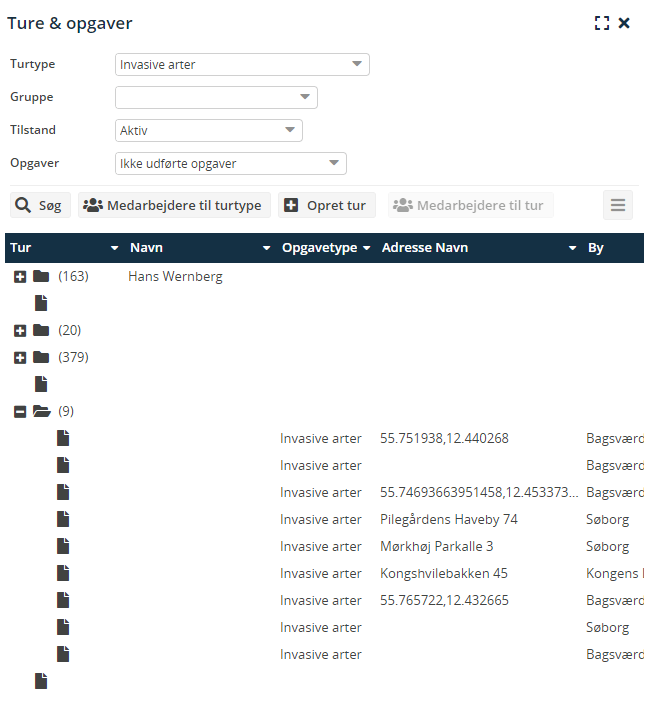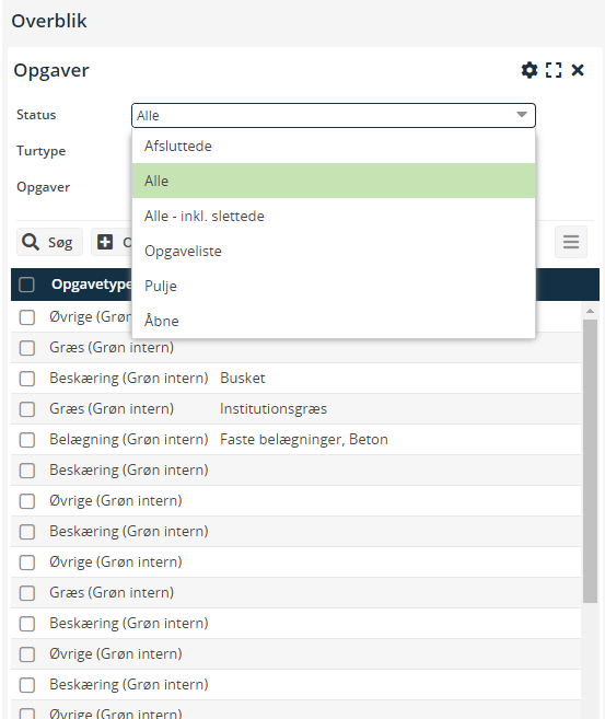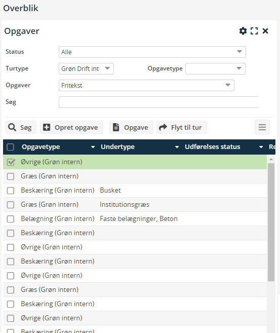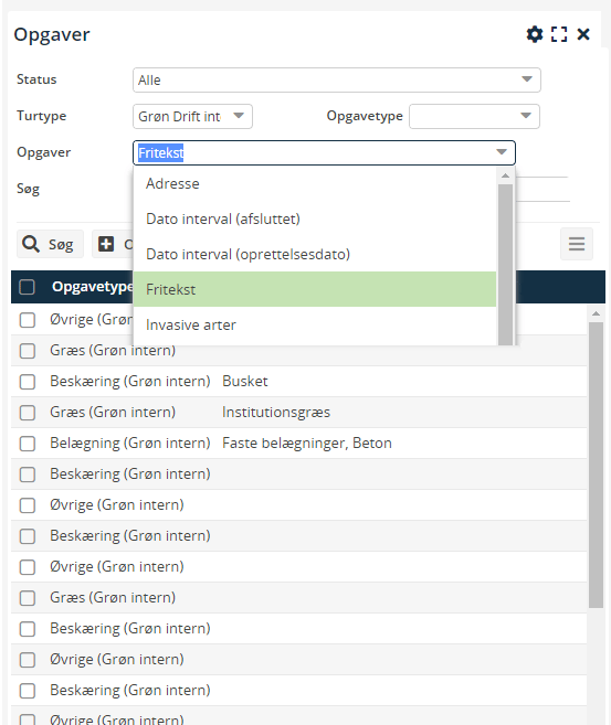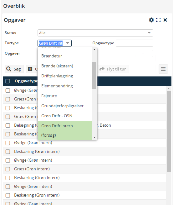 Her fremsøges opgaverne ved hjælp af de fastdefinerede søge felter i toppen, Status, Turtype, Opgavetype og Opgaver. Det er muligt at få udviklet specielle søgekriterier.